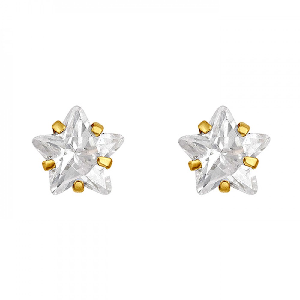 Broquel de Oro 10k con zirconia corte de estrella de 4mm en montadura de uñas y perno de bolita. (medidas aproximadas).