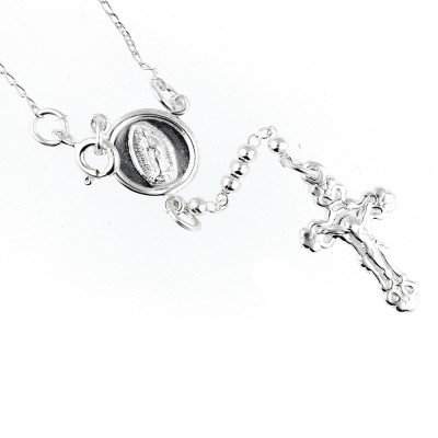 Rosario de plata 925 con bolitas lisas de 2 mm, cadena tejida tipo rada facetada, imagen de la Virgen María y Cruz de 23 mm de largo x 14 mm de ancho. Las medidas son aproximadas.